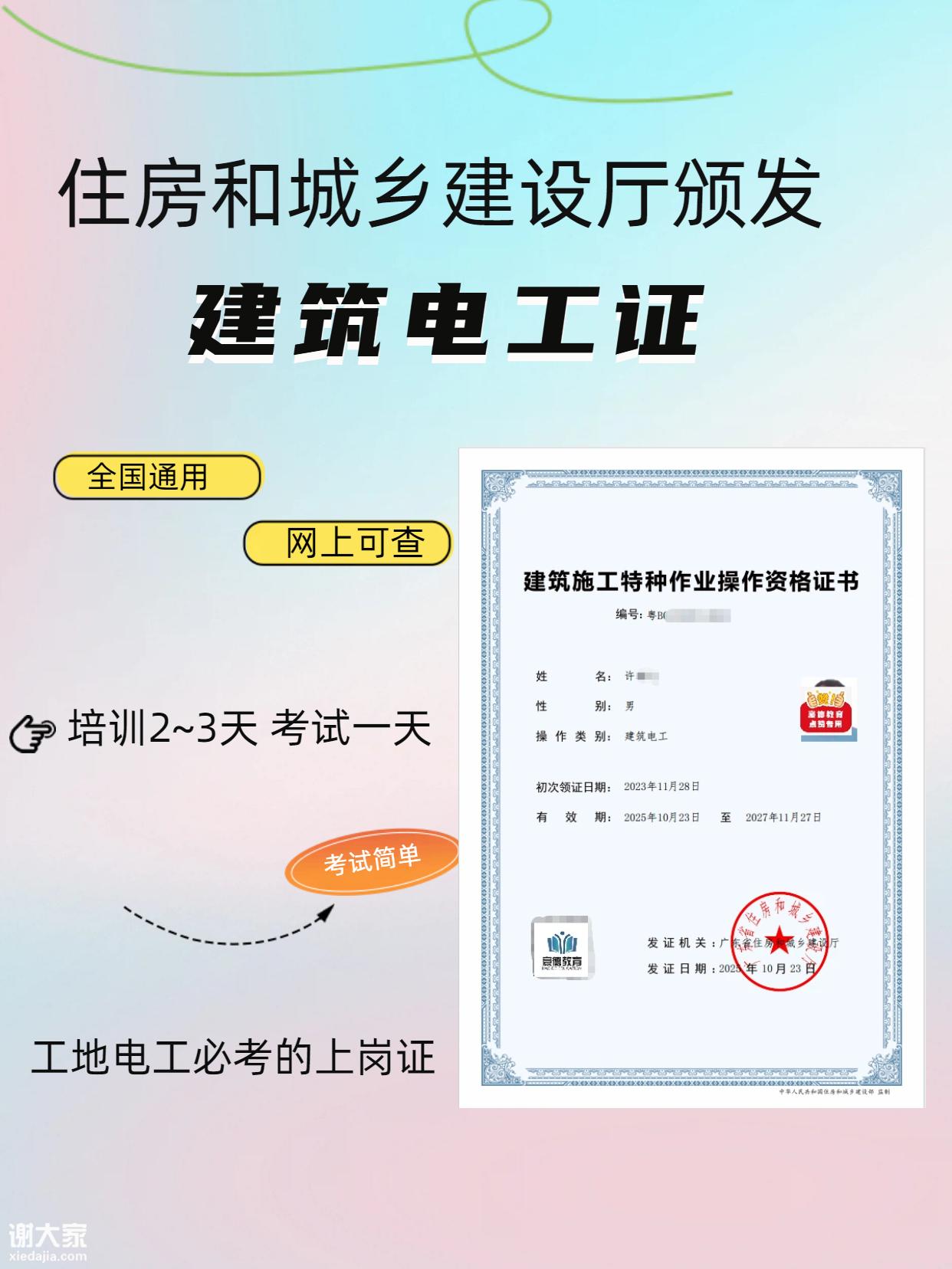 建筑电工证由住建部门颁发,主要用于建筑工地的电力安装与维护工作,核心职责是负责工地上临时用电相关作业。