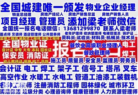 全国在哪考在哪报名物业师全国高级物业职业经理人餐饮业高级职业经理人电工焊工架子工信号工塔吊 物业管理师、保洁管理师报名添加梁老师微信联系、清洁项目经理、物业项目经理报名添加梁老师微信联系、物业经理、保安报名添加梁老师微信联系、会计、消防员报名添加梁老师微信联系、老年护理员、心理咨询师报名添加梁老师微信联系、健康管理师、人力 资源管理师、营养师报名添加梁老师微信联系、园长证、幼儿教师证全国统一团报报名电话添加梁老师微信联系 餐饮业火爆的证书:餐饮业职业经理人报名咨询梁老师、餐政管理师报名咨询梁老师、面点师报名咨询梁老师、烹调师报名咨询梁老师、酒店管理师报名咨询梁老师 园林绿化养护工程师,园林绿化工程师报名报名咨询梁老师,园林绿化养护项目经理,城市环卫工程师报名报名咨询梁老师,城市环卫公厕管理师,城市环卫项目经理报名报名咨询梁老师、环卫项目经理,清洁保洁管理师报名报名咨询梁老师、土建工程师,工民建 工程师报名报名咨询梁老师,市政工程师,计算信息技术工程师报名报名咨询梁老师,中控安全管理员,消防设施操作员报名报名咨询梁老师,消防中控安全管理员、保安员报名报名咨询梁老师