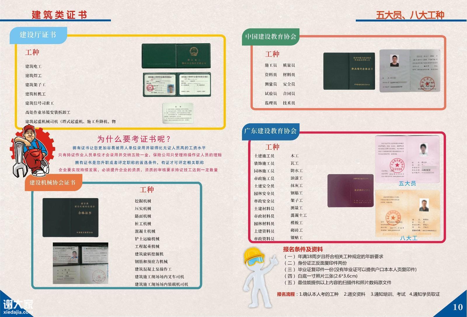 中国建设教育协会全国的建筑9大员:施工员、质检员、安全员、监理员、材料员、资料员、试验员、测量员、合同员监理工程师、物业管理员、机械造价员造价员(土建、安装)、林业造价员(土建、安装、林业、市政、装饰)、中建造价员(土建、安装)电子造价员(5个专业)
