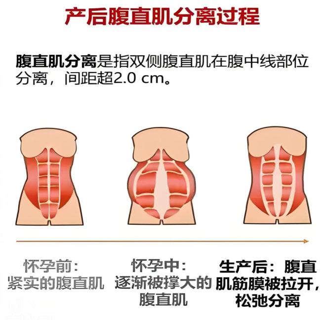 在开始任何腹部恢复训练之前,首先要判断自己是否存在腹直肌分离。怀孕期间,增大的子宫会使腹部肌肉被过度拉伸,导致腹直肌(就是那几块“腹肌”)从腹白线处分开,这就是腹直肌分离。