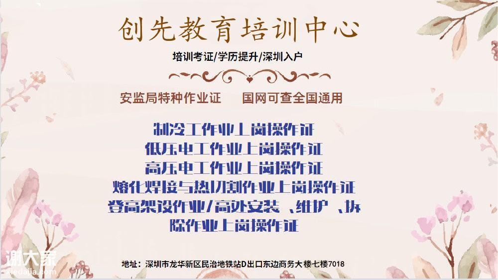 广东省深圳市应急管理局颁发的电工作业证,焊接与热切割作业证,制冷与空调作业证,高处作业证等上岗操作证报名咨询创先教育马老师。快速考证,价格实惠,十年老机构,主营项目有:培训考证,学历提升,深圳入户。欢迎您随时上门来现场报名。