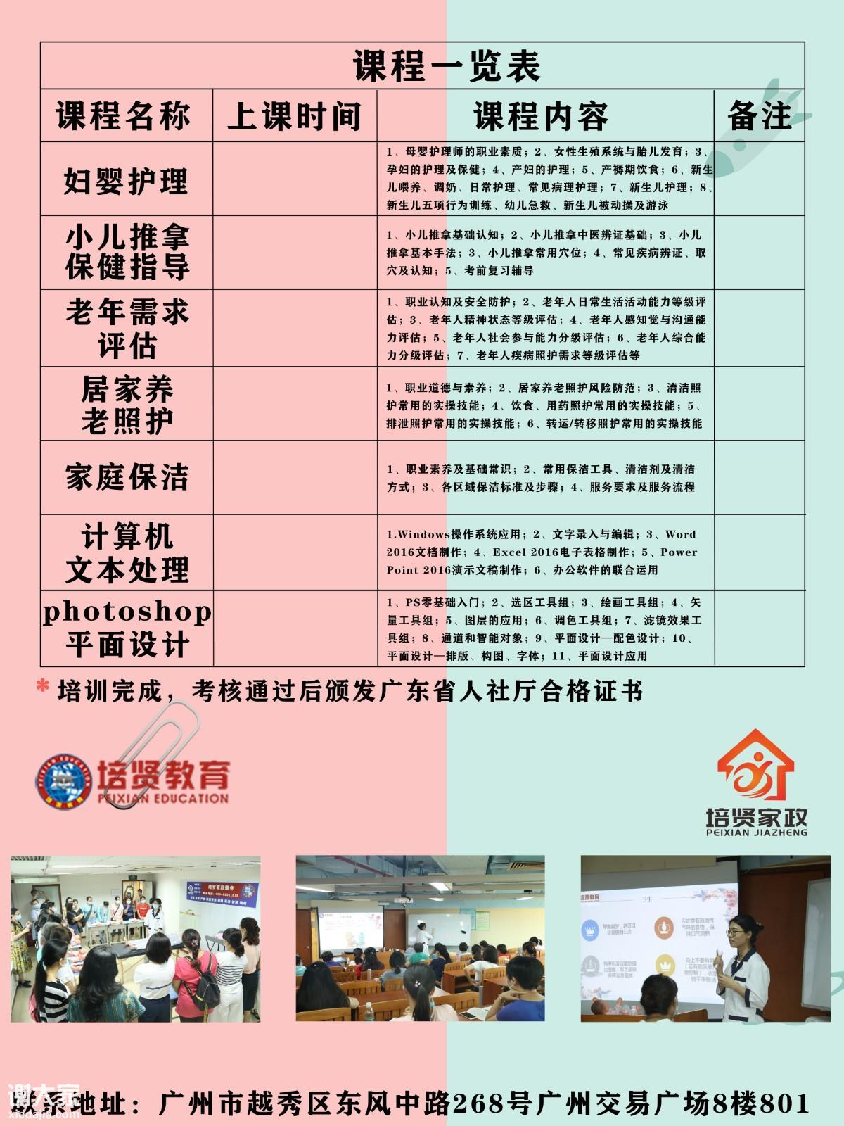 响应【南粤家政】工程、推动家政人员专业化、提高综合性技能,更好的为现代家庭更好服务,广州市越秀区培贤职业培训学校,联合人社局,推出多项免费技能培训,助力南粤家政、为提供更多专业人才、供给市场需求。