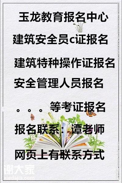 建筑行业电工证 在建筑工地上从事电工操作必须要有建筑电工证。 建筑电工包括电气工程安装和工地现场电气设备维修。 建筑电工分两种: 1、建筑安装电工,一般指水电安装电工。 2、建筑维修电工,这种电工在工地从事维修工作。 考试主要内容:安全用电常识、触电急救、常见的灭火方法与灭火器的使用、三相四线制用电器配线、家庭用电配线、三相异步电动机的开关与自锁、普通三相电动机正反转配线与控制、半导体基本知识。 报名情况参照如下: 学校:深圳玉龙教育培训学校 报名联系:谭老师(网页上有联系方式) 发证机关:广东省住房与城乡建设厅颁发 上班时间:上午9:00--下午20:00(礼拜正常值班) 报名资料:身份证正反拍照和2寸红底照片电子档 报名地址:深圳龙华新区人民路美丽AAA大厦东座1208 乘车路线:地铁:龙华线-龙华地铁站b出口(华润万家) 公交:锦华新村或者龙华街道办。 期待您的咨询,真诚的为您解决问题,合作共赢。