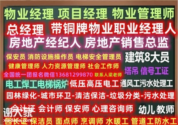 清远考物业经理项目经理物业管理师报名条件监理工程师装配式工程师园林绿化清洁保洁管理师报名 物业经理培训费1200,项目经理1400,物业管理员950,物业管理师中级1400,高级1500报名咨询梁老师 物业经理、项目经理、物业管理员、物业总经理报名中报名咨询梁老师。 EPC工程总承包项目经理、建筑八大员报名咨询梁老师、监理工程师、电工报名咨询梁老师、焊工、高空作业报名咨询梁老师,叉车,架子工报名咨询梁老师,信号工,塔吊报名咨询梁老师,高级环卫公厕管理师报名咨询梁老师,垃圾分类项目经理,河道保洁工程师,城市环卫工程师报名咨询梁老师,城市环卫项目经理,城市排水项目经理报名咨询梁老师,城市排水项目经理,河道清洁工程师报名咨询梁老师,