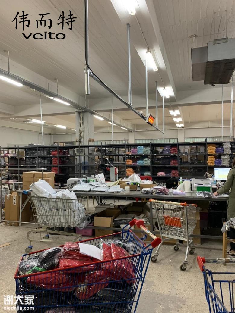 这座存放面料与成品织物的仓库中,黑色金属货架自地面直抵六米高的天花板,每层整齐堆放着各色布料,通道中堆满待分拣的纸箱,墙角也密集排列着带标签的货物。以往采用的传统暖风机悬挂于墙角铁架,出风口持续向地面输送热风。然而热空气自然上行,导致仓库顶部货架区域的温度始终比地面高出约
